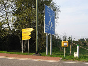 Post , der direkt auf dem Grenzverlauf steht. Auf dem belg. Fernwegweiser sind