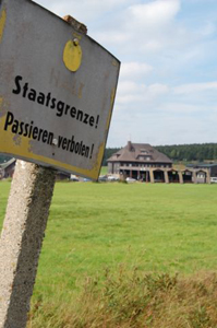 "Achtung Staatsgrenze" steht. Das Schild ist genau betrachtet Satire pur, denn
