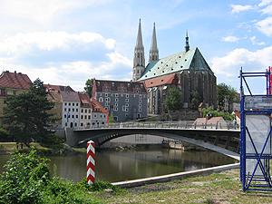 über die Lausitzer Neiße zur dt. Seite mit neuer Altstadtbrücke und Peterskirche